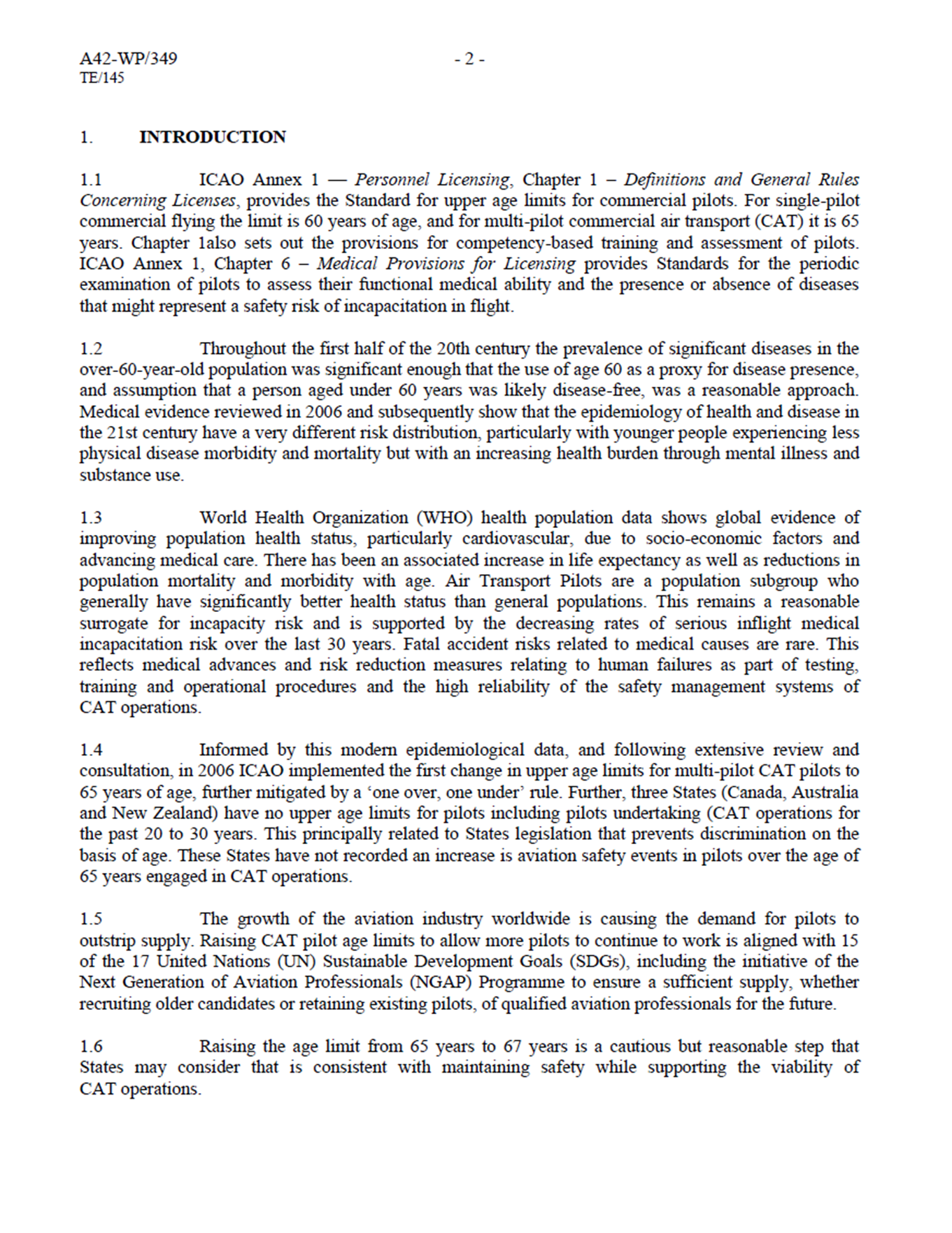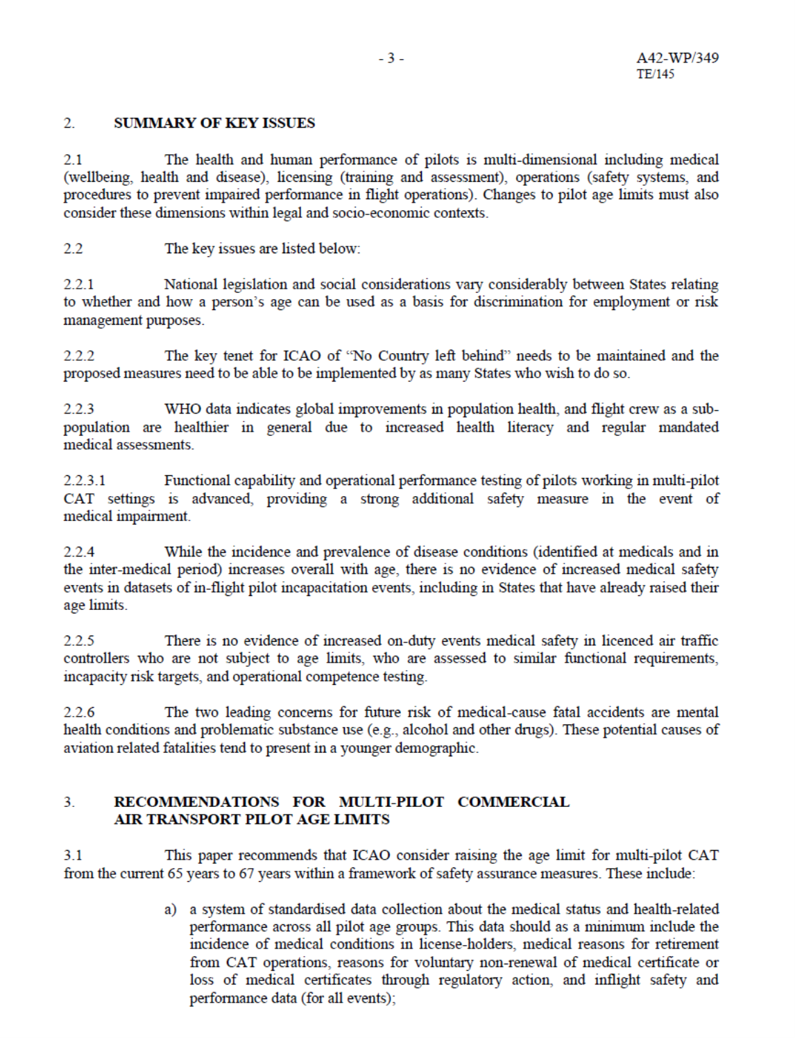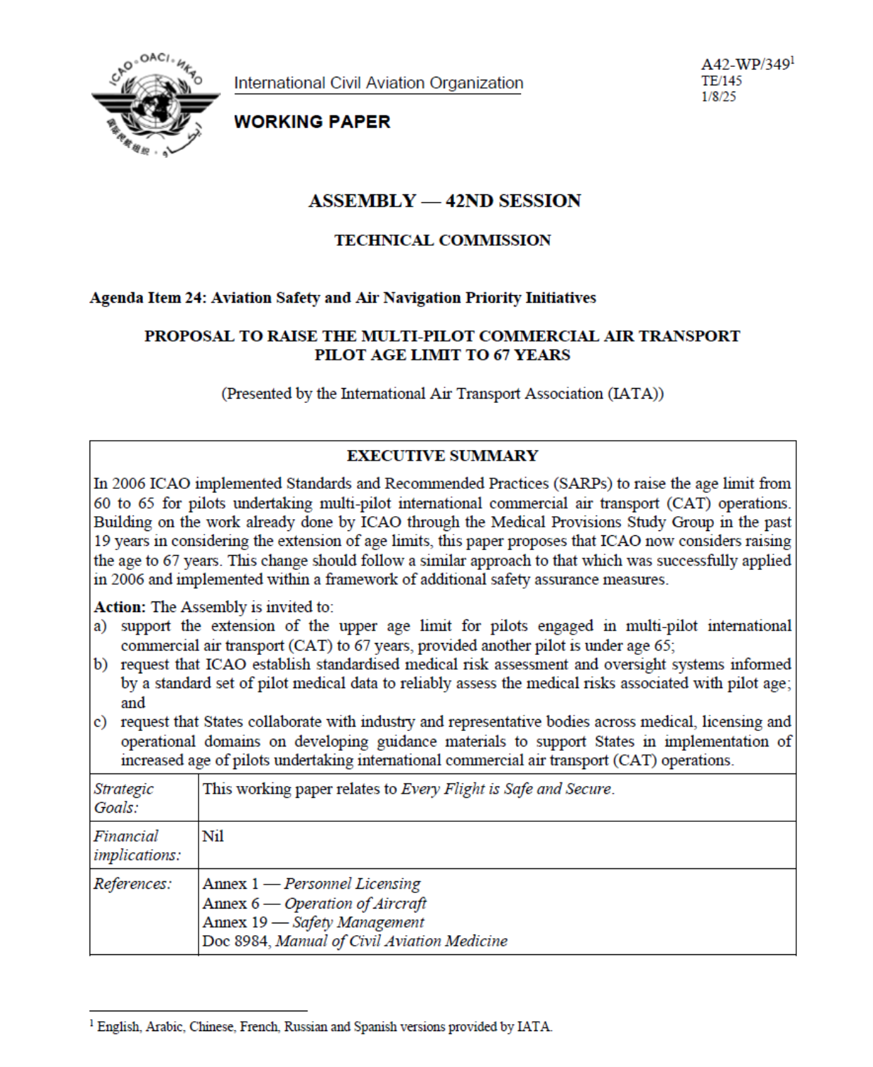 Amid a shortage of available pilots compared to the rising demand spurred by aviation sector growth, the International Air Transport Association (IATA), which represents about 350 airlines, and over 80% of global air traffic, has submitted an Working Paper A42-WP/349 to the ICAO Assembly calling for the multi-pilot commercial transport age limit to be raised from 65 to 67.