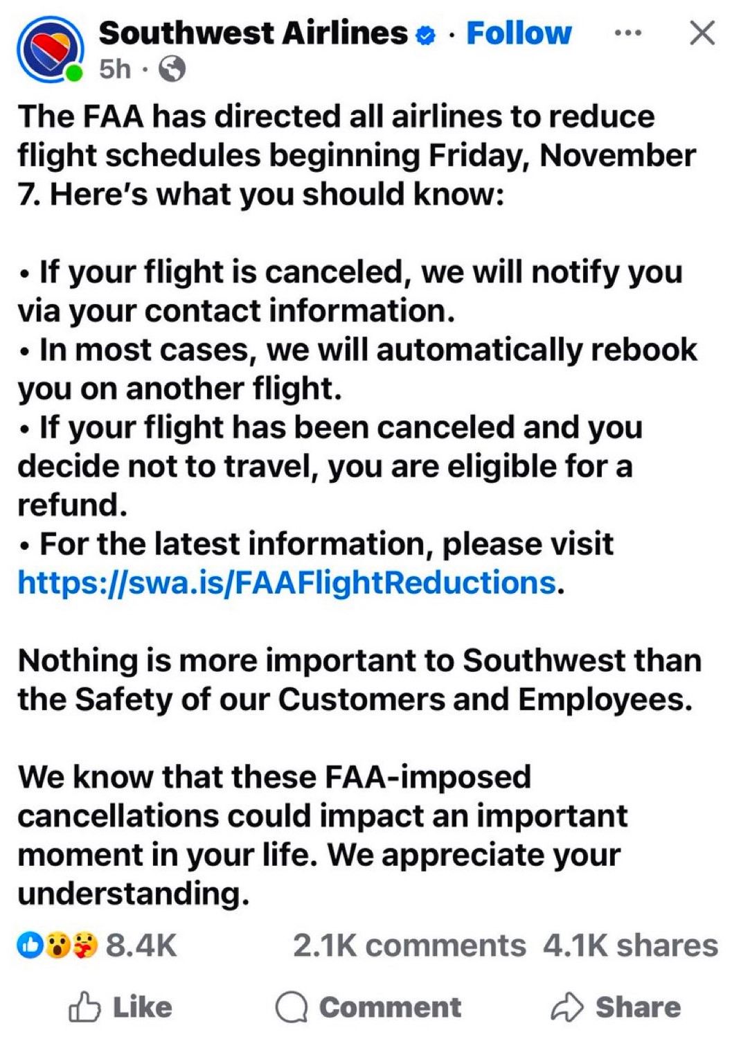 Southwest Airlines issued a waiver for travel between Nov. 7 to 12, allowing rebooking or standby within 14 days without extra fare.