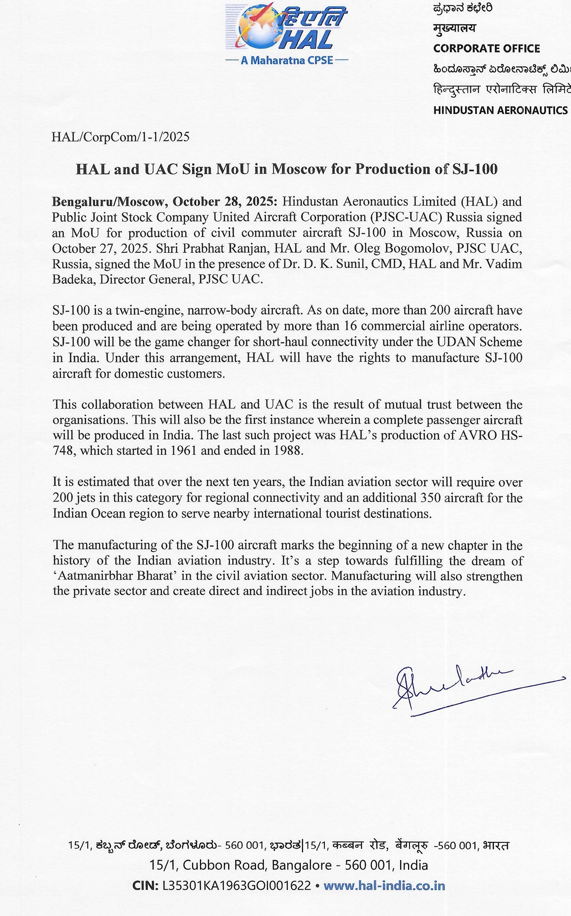 Hindustan Aeronautics Limited (HAL) and Russia's Public Joint Stock Company United Aircraft Corporation (PJSC-UAC) have signed a Memorandum of Understanding (MoU) to produce for the first time a passenger aircraft, the SJ-100, in India.