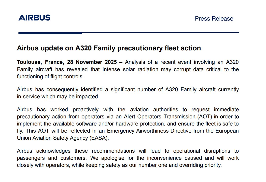 In a statement, Airbus explained that a recent incident in one of its aircraft has revealed that intense solar radiation can corrupt data critical to the operation of flight controls. The company has admitted the impact that this decision will have, stating that "Airbus recognizes that these recommendations will cause operational disruption to passengers and customers".