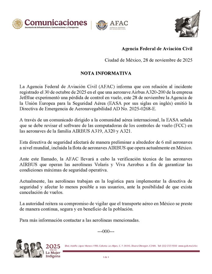 The Federal Civil Aviation Agency of Mexico reported on this November 28 that, following the incident on October 30, 2025, when a JetBlue A320-200 aircraft lost control in mid-flight, it will conduct a technical verification of the Airbus aircraft operated by Volaris and Viva Aerobus to ensure their maximum operational safety.