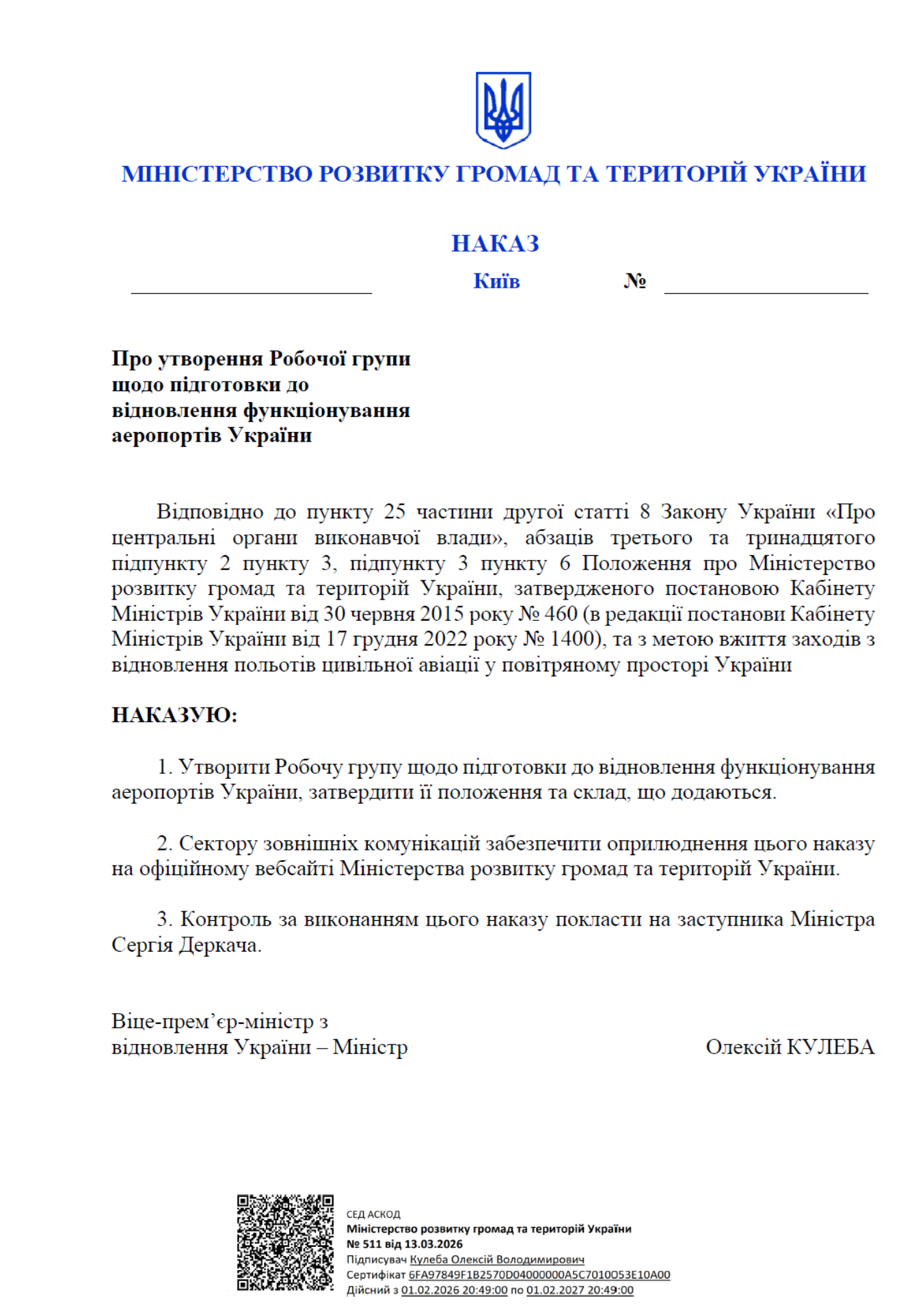 Deputy Minister for Reconstruction, Serhiy Derkach, is responsible for overseeing the implementation of this order.